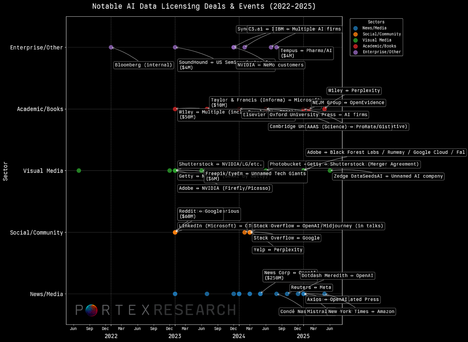 Data licensing for AI has grown considerably since 2022. The timeline below shows a few of the major announced deals and their respective sector.