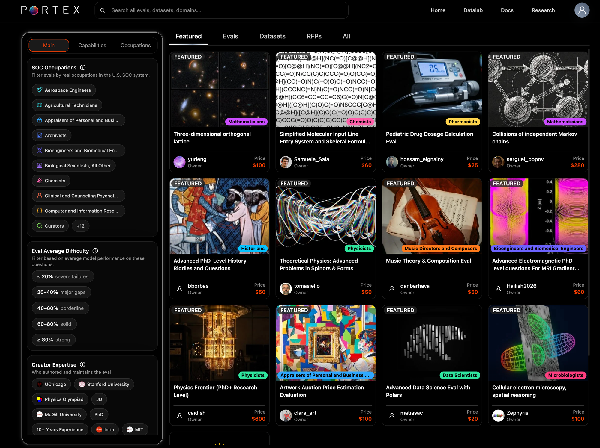 Over the last few months, we've had the privilege of onboarding over 100 experts across academia and applied R&D to the Portex Datalab. Distinguished faculty members at top global universities, research fellows running frontier wet labs, former physics olympiads—this is just a small sample of the talent using Portex to iterate on agent evals. The datalab has allowed experts to license frontier AI data through a novel product experience and keep their premium evals private. This has resulted in an impressive universe of over 3,000 tasks testing AI agents in dozens of economically-significant domains.