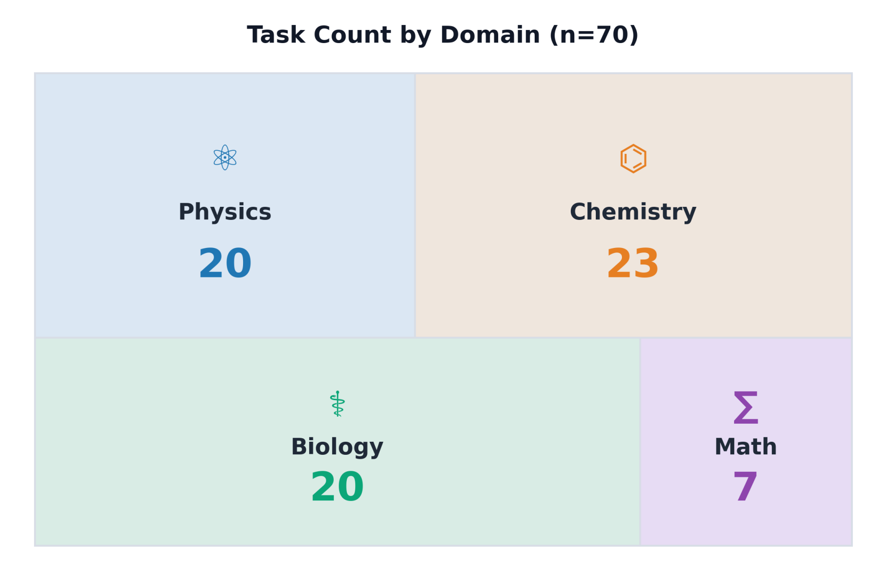 The benchmark is composed of 70 tasks, with 20 tasks in Physics, 23 in Chem, 20 in Bio, and 7 in Mathematics.