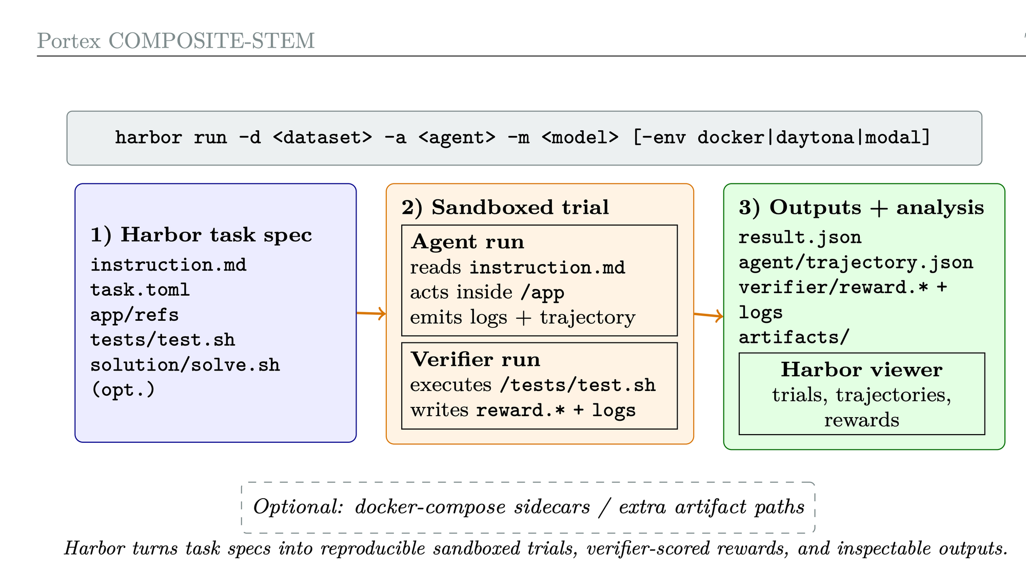 Spanning 70 realistic tasks from 20 top experts on Portex, COMPOSITE-STEM is the culmination of hours of work and research spent on the Portex Datalab to design frontier evals for the sciences. Our paper, accessible on arXiv, walks through all of the details of task curation and performance across 4 SOTA models. We're also excited to make the benchmark fully open source, with all expert-written tasks and solution rubrics released on Hugging Face below. All tasks are fully Harbor compliant, and we've open sourced a harbor adapter to use COMPOSITE-STEM with this popular agent eval framework.