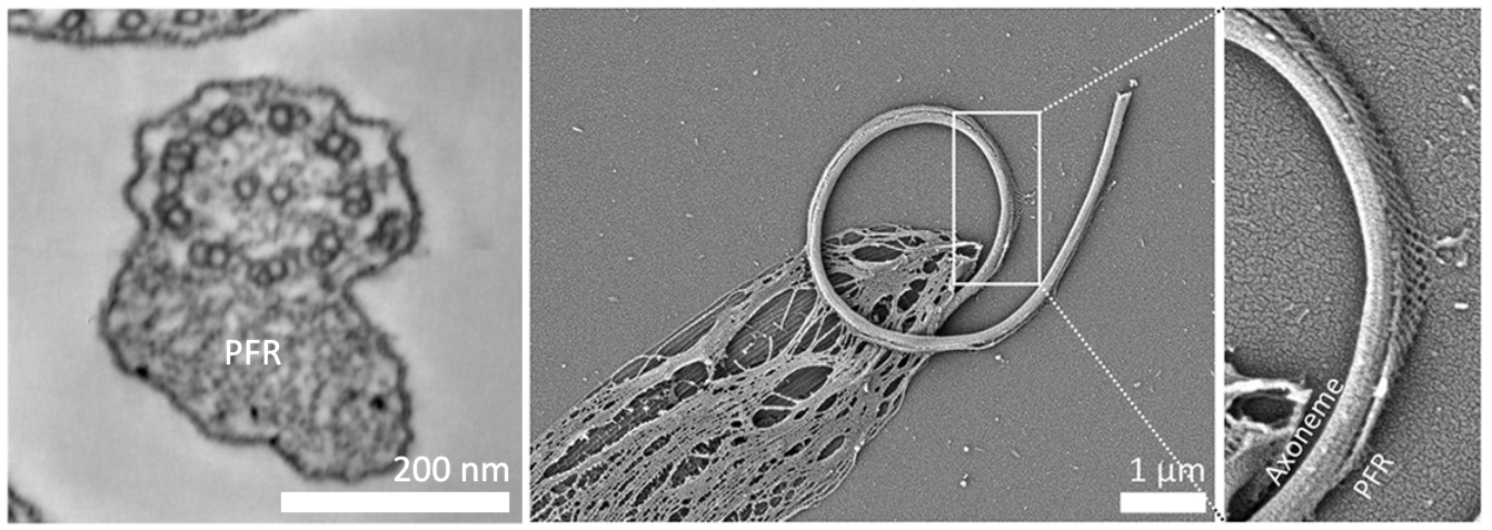 refs/d465ab9a.png is an image of a crop from a thin section electron microscopy image of the Leishmania parasite. The Leishmania parasite swims using a single flagellum which has an asymmetric paraxial structure with a lattice-like internal structure, the PFR, as shown in the thin section electron microscopy image on the on the left. An axoneme mutation leads to curling up of the flagellum, as shown in the scanning electron microscopy of a detergent-extracted cell on the right, with the axoneme and PFR visible. The preferred bending plane of the flagellum is determind by the central pair microtubules. Dynein motor proteins on the axoneme doublets cause microtubule sliding which leads to flagellum bending. Based on these images, the dyneins on which set of doublets are over-active, leading to the curl?